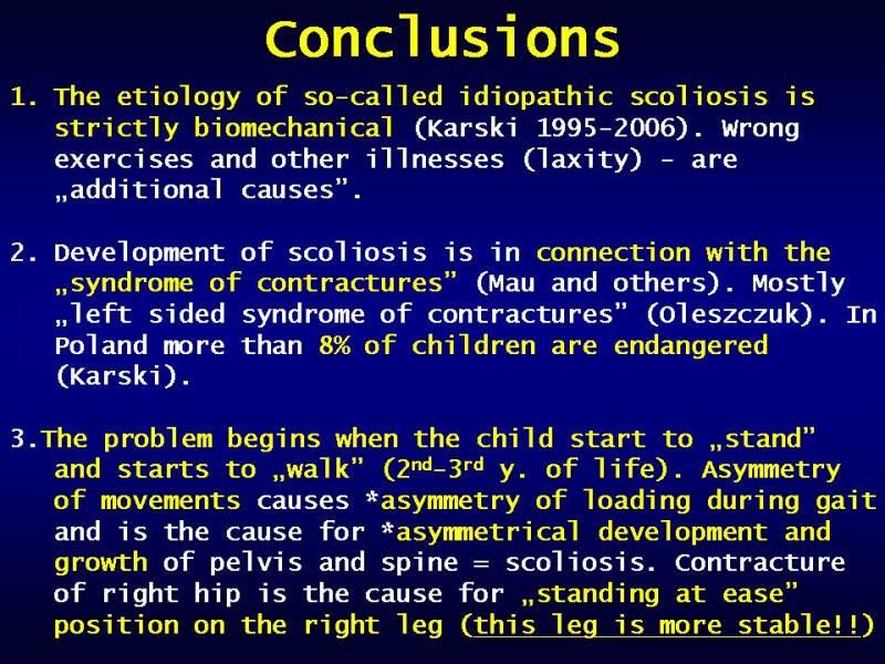 was described "C" shaped scoliosis. In October / November 2006 was confirmed the observation from 2001 namely - in II epg group was/is also "S" scoliosis, which was called IInd/B scoliosis. Both types of spine deformity are connected only with permanent "standing at ease" only on the right leg. The differences between "S" scoliosis in I epg and "S" scoliosis in II/B epg are: "S" I epg - first rotation deformity, stiffness of spine, rib hump, both curves develop at the same time, typical is progression. In "S" scoliosis II/B epg - rotation deformity doesn't exist, no stiffness of spine, no rib hump or very small, the thoracic curve develop as secondary. No progression. Another observation from October / November 2006: in the IIIrd epg group "I" deformity (without significant curves but with stiffness of spine and also without big ribs hump) I noticed connection with gait but not with "standing at ease" on the right leg [October / November 2006]. | | obejrzano razy: | 3932 | | data dodania: | 2007-04-27 15:48:34 | | wielkość pliku: | 101.4 kB | | rozdzielczość: | 800 x 600 |